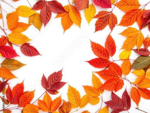 Autumn leaves frame with vibrant colors of red orange and yellow on a white background creating a border