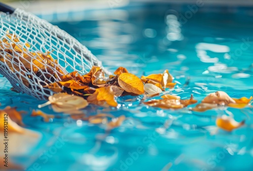 Autumn leaves in pool. A pool skimmer collects bright orange and yellow autumn leaves floating on the surface of clear blue water.