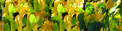 Autumn leaves in the forest or in the park are lit by the sun. Colorful background. Autumn blurred background. Selective focus, side view, place for text.