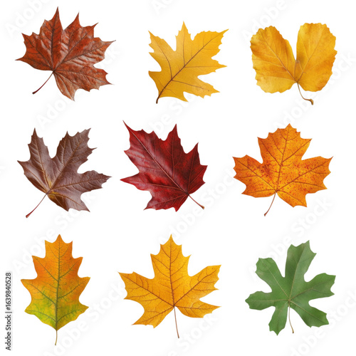 Autumn leaves in various colors and shapes create vibrant display of nature beauty