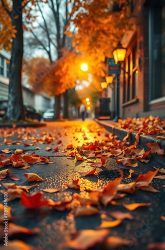 Autumn leaves on city street at dusk.
