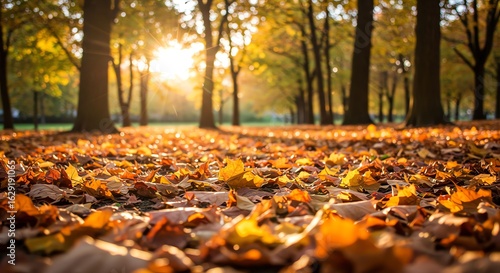 Autumn Leaves on Ground in Park During Sunset with Warm Colors