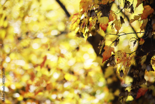Autumn Leaves on Tree Branches with Golden Sunlight in a Forest