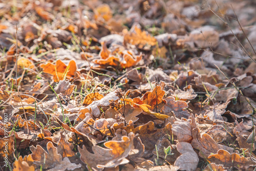 Autumn leaves with frost macro
