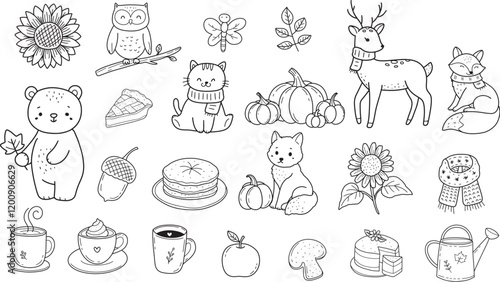 Autumn line art fall with gnome wildanimal pumpkin doodle outline elements, hand drawn leaf flower isolated.vector illustration