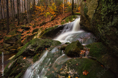 Autumn long exposure of creek Black (Big) Stolpich waterfalls in Jizera Mountain. Water falls into a deep forest canyon full of granite stones and rocks covered with green moss. Czech Republic
