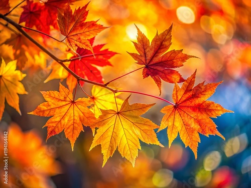 Autumn Maple Branch - Vibrant Red and Orange Leaves, High Depth of Field Stock Photo