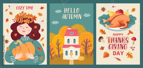 Autumn mood. Set of three colored trendy vector illustrations. Thanksgiving day. Flat design.