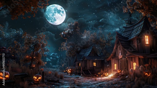 Autumn night concept in a small village with pumpkins and full moon
