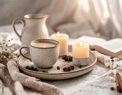 Autumn or winter arrangement in shades of white and brown with a cup of coffee or tea, spices, a woolen blanket, candles, lamps, and a jug