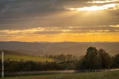 Autumn orange sunset with trees and fields near Roprachtice village in mountains