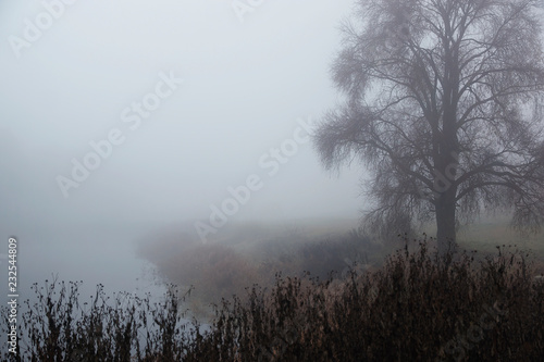 Autumn park. Park in the fog. A misty morning fog in the park.