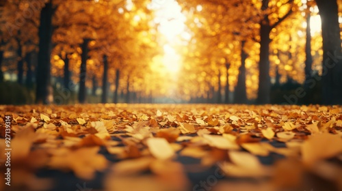 Autumn park pathway covered with golden fallen leaves in soft sunlight..