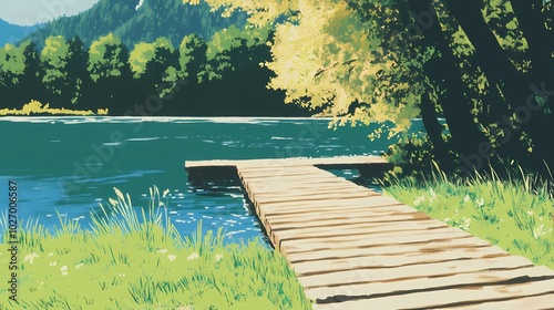 Autumn park with a serene lake and a wooden pier, surrounded by golden leaves and reflecting fall colors on the water.