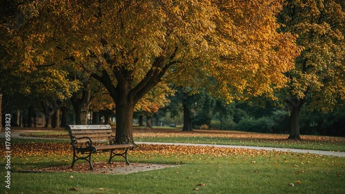 Autumn park with bench for relaxation, surrounded by colorful fall foliage.
