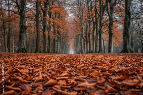 Autumn path lined with tall trees and colorful leaves in a misty forest at dawn