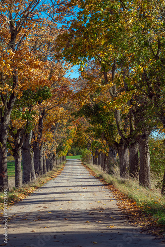 Autumn pathway lined with vibrant foliage in a rural setting during the afternoon