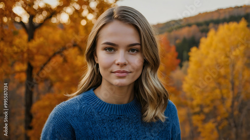 Autumn Portrait: A young woman with long brown hair and a soft smile, wearing a blue sweater, stands against a backdrop of vibrant autumn foliage.