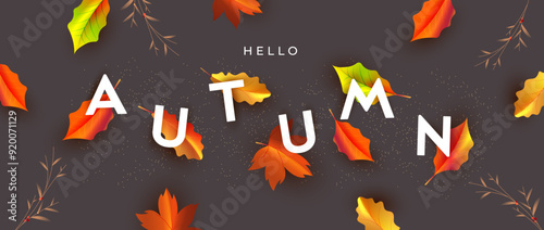 Autumn poster or cover. Modern autumn design with autumn leaves and typography. Trendy fall template for background, sale banner, flyer, advertising, web, social media, marketing material.