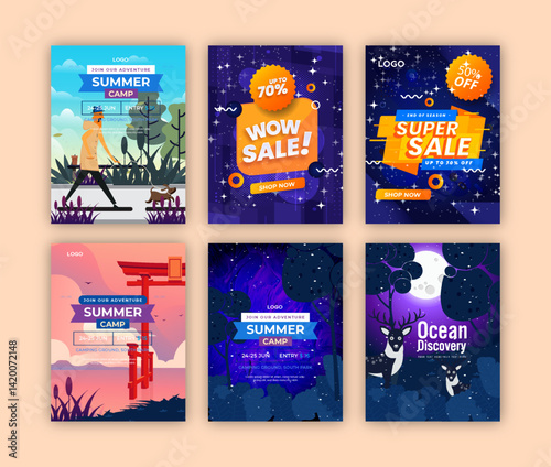 Autumn sale banner, poster or flyer set. Vector illustration with frame of bright beautiful leaves on white, blue and red background. Template Set for advertising, web, social media and fashion ads