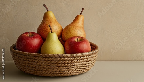 Autumn scene featuring a harvest of apples, pears, and pumpkins in a rustic setting.