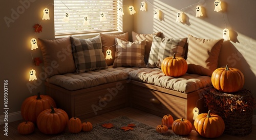 Autumn scene with pumpkins pillows ghost string lights near a window