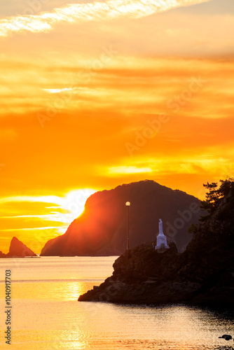 秋の海上マリア像と夕日 熊本県天草市 Autumn sea statue of Mary and sunset. Kumamoto Pref, Amakusa City.