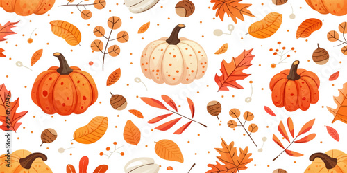 Autumn seamless pattern with pumpkins, acorns and autumn leaves on a white background