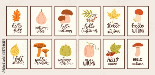 Autumn simple poster big set. Fall flyer doodle collection. Vectical banner autumn elements. Autumn interior design poster, end of season promo template. Vector illustration.