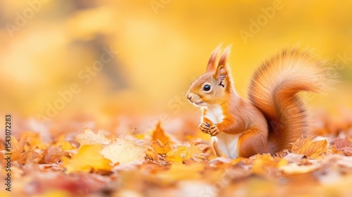Autumn Squirrel's Solitude: An adorable red squirrel perches gracefully amidst the golden hues of autumn leaves, embodying the essence of fall.