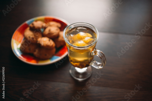 Autumn Still Life: Herbal tea on a wooden table near the window. The sun's rays on a cup of brewed tea. A cup of hot chayas pichenem on a sunny day on the background of the window. Autumn tea