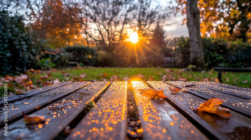 Autumn Sunset on Wet Bench, Golden Hour Illustration