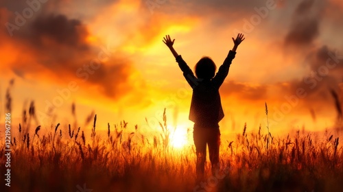 Autumn Sunset Praise: Woman Silhouette Celebrating Life and Faith in Meadow
