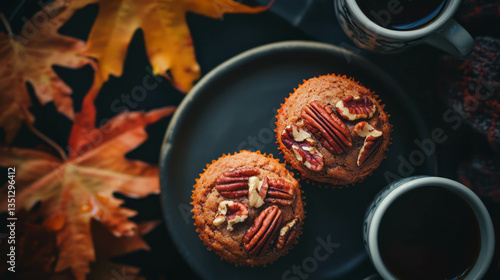 Autumn sweet potato muffins with pecans and fall leaves for seasonal baking inspiration