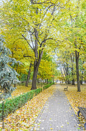 Autumn time in outdoor park with colored yellow orange trees, leaves