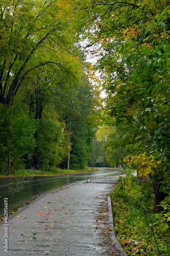 Autumn urban landscape, winding asphalt road with fallen leaves under yellowing trees. Cloudy weather.