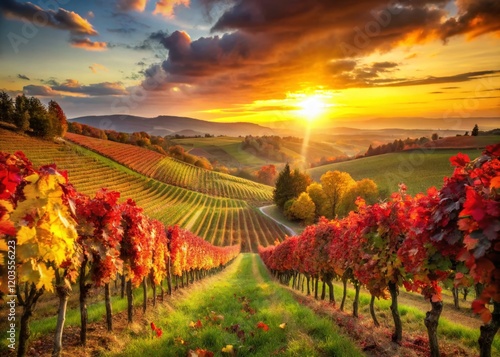 Autumn Vineyard Landscape: Golden Vines at Sunset, Rule of Thirds Composition