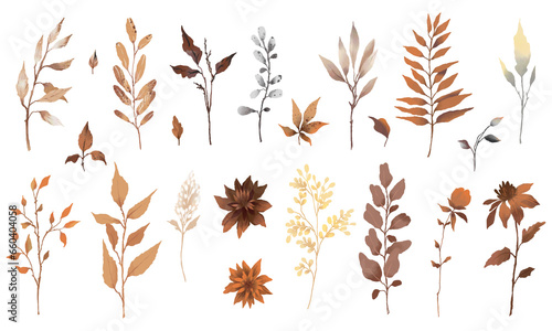 Autumn watercolor set of flowers, leaves and branches in brown colors isolated on white background. Fall season decor