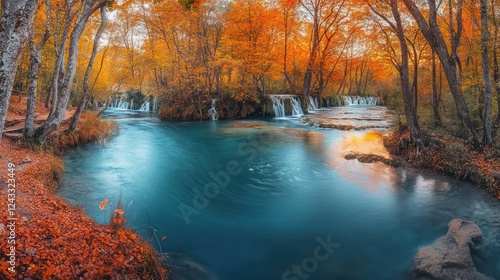 Autumn waterfall, forest stream, colorful leaves, tranquil nature scene, scenic wallpaper
