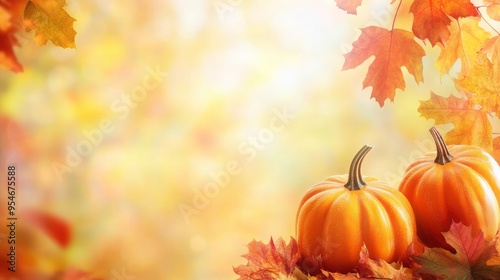 Autumn wide banner with Orange Pumpkins, Colored Autumn Leaves Against Blurred Pastel Background. Thanksgiving Day Or Autumn Seasonal Sale Concept with space for text with generative ai
