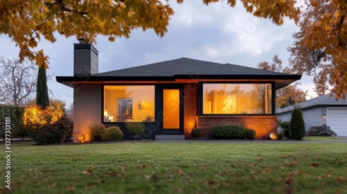 Autumnal Abode: Capturing the essence of a cozy home during autumn, highlighted by vibrant fall foliage and warm inviting lighting.