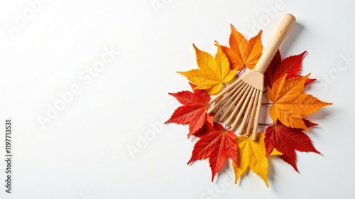Autumnal Arrangement Featuring a Small Wooden Rake and Colorful Leaves on a White Background