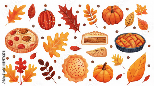 Autumnal arrangement showcasing fall leaves, various pastries, pumpkins, and a slice of pie in warm colors