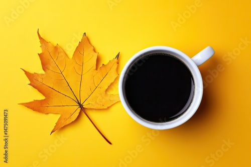 Autumnal coffee A single cup of black coffee rests beside a vibrant yellow maple leaf on a bright yellow background