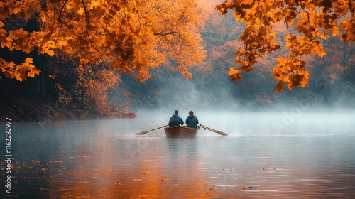 Autumnal Fog Envelops Couple Rowing Tranquil Lake