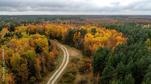 Autumnal forest path aerial view, cyclists, overcast sky, nature travel