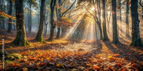 Autumnal Forest Radiance Sunbeams Illuminate Dew-Kissed Spiderweb Amidst Fallen Leaves and Majestic Trees