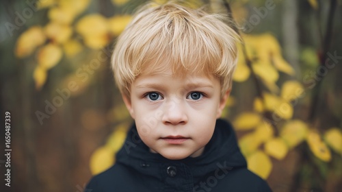 Autumnal forest whispers surround a solemn blonde Caucasian boy, evoking Samhain's mystery and the Enchanted Forest festival