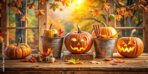 Autumnal Glow Jack-O-Lanterns and Pumpkins on a Wooden Table with Fall Foliage, Windows, and a Sunlit Background