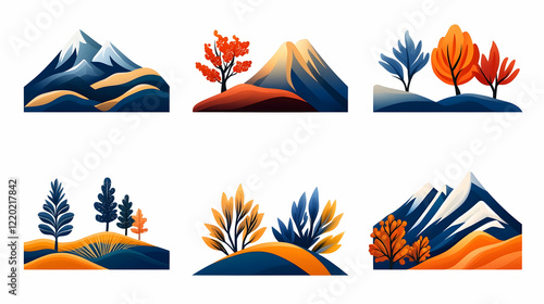 Autumnal landscape illustrations; mountains, trees, hills; nature design elements; website, app, or print design